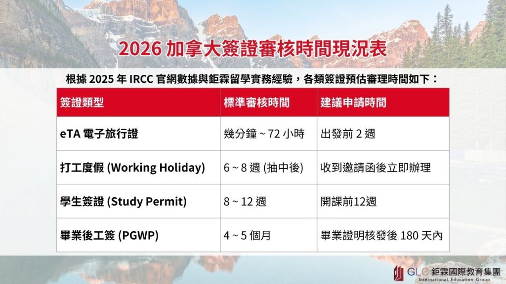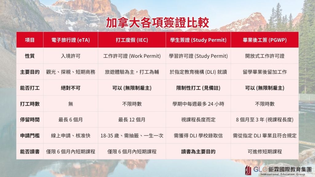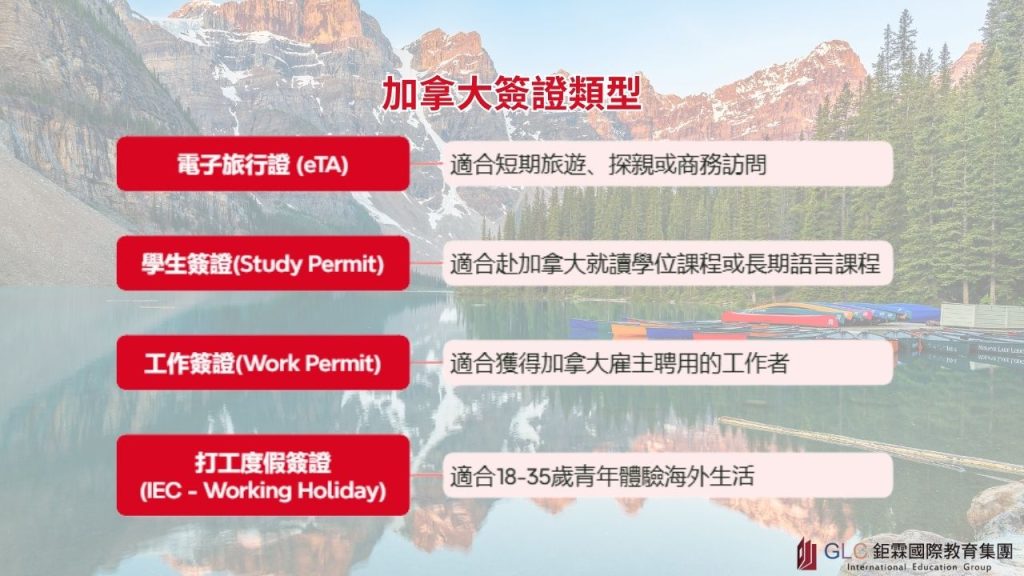 別擔心!以下是加拿大各種簽證介紹:電子旅行證 (eTA)、打工度假簽證 (Working Holiday)、學生簽證 (Study Permit)、PGWP(畢業後工簽)。