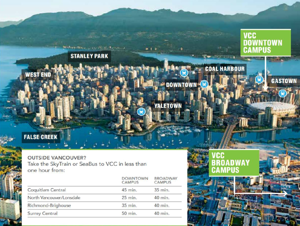 VCC在溫哥華設有兩大主要校區,包括 Broadway 校區與 Downtown 校區。Broadway 校區以健康照護、技職與專業訓練課程為主,而 Downtown 校區則集中於商業、設計與服務產業領域。兩個校區皆位於交通便利的市區位置,鄰近大眾運輸系統,方便學生通勤與日常生活。